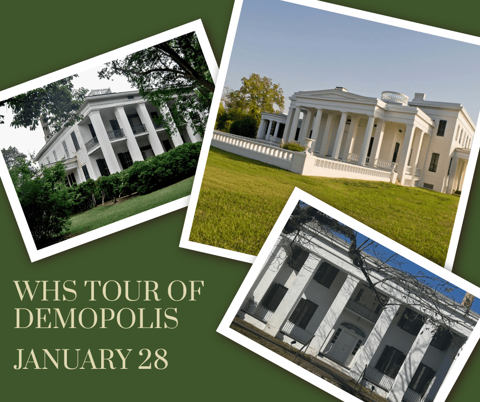 The Wilcox Historical Society invites members and friends to join us for a special day trip on January 28th to Demopolis to tour three of Alabama’s most significant historic homes: Gaineswood, Lyon Hall, and Bluff Hall. This guided excursion offers a wonderful opportunity to experience outstanding examples of 19th-century architecture while enjoying fellowship with fellow history enthusiasts.